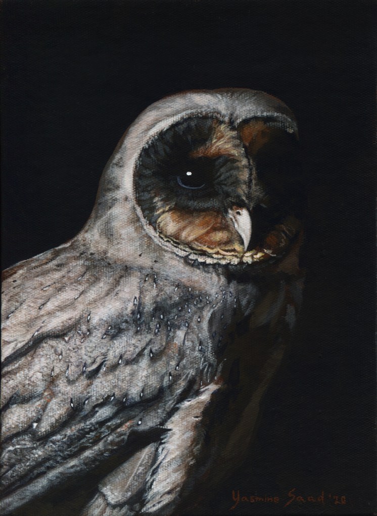 Sentinel (Barbagianni melanico) 2020, acrilico su cartone telato (18 x 13 cm).Fotografia di riferimento di Jayne Michelle. Collezione privata Related