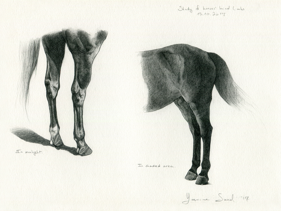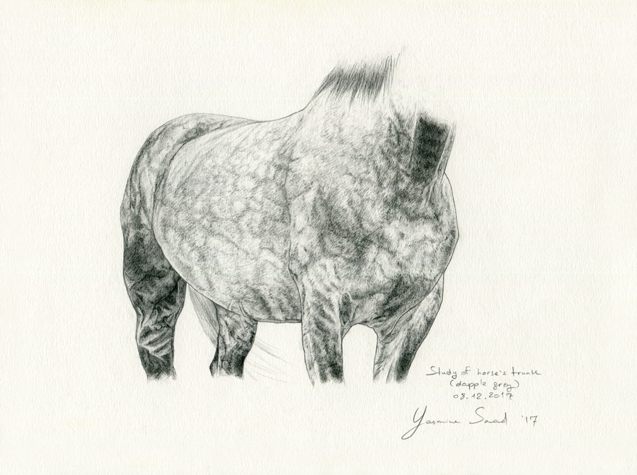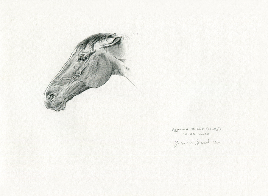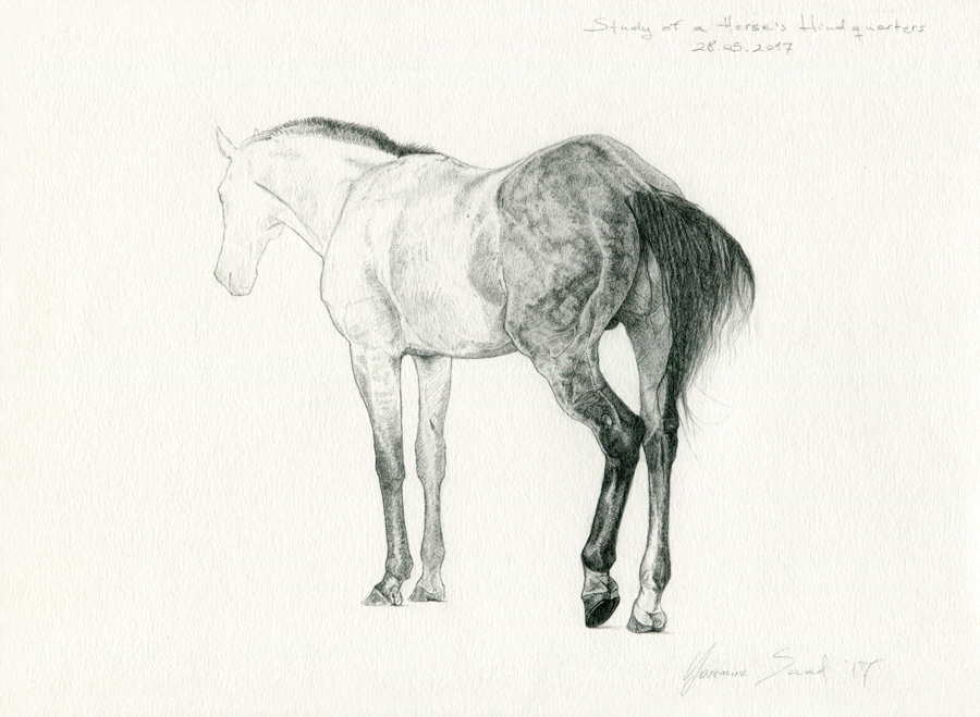 Gesto di minaccia aggressiva (studio). Matita portamine su carta, foto di riferimento dell’artista. Collezione dell’artistaStudio del tronco di un cavallo (grigio pomellato). Matita portamine su carta, foto di riferimento dell’artista. Collezione dell’artistaStudio degli arti posteriori dei cavalli. Matita portamine su carta, foto di riferimento dell’artista. Collezione dell’artistaStudio dei quarti posteriori di un cavallo. Matita portamine su carta, foto di riferimento dell’artista. Collezione dell’artista